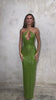 The Icon – A shimmering green gown crafted from zero-waste fabric, adorned with hand-placed glass crystals for a radiant finish. Designed with a stretch fit and mesh lining, it drapes effortlessly, featuring adjustable neck ties and a slip-on design.